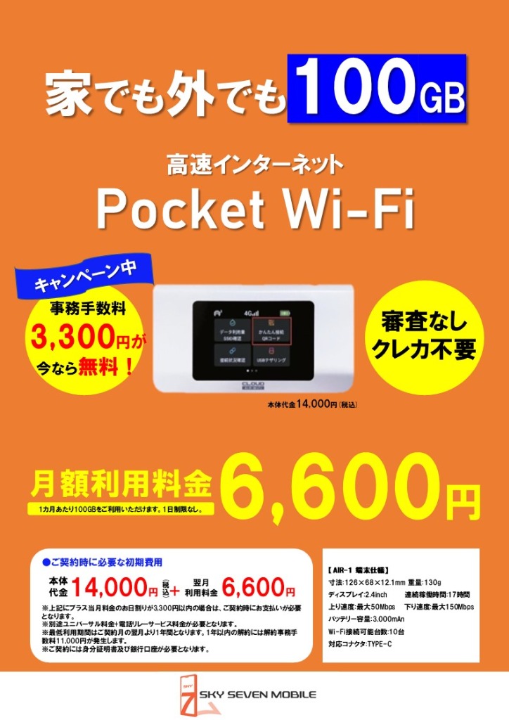 只今100GBのポケットWi-Fiの事務手数料(3,300円)無料キャンペーン中です!
